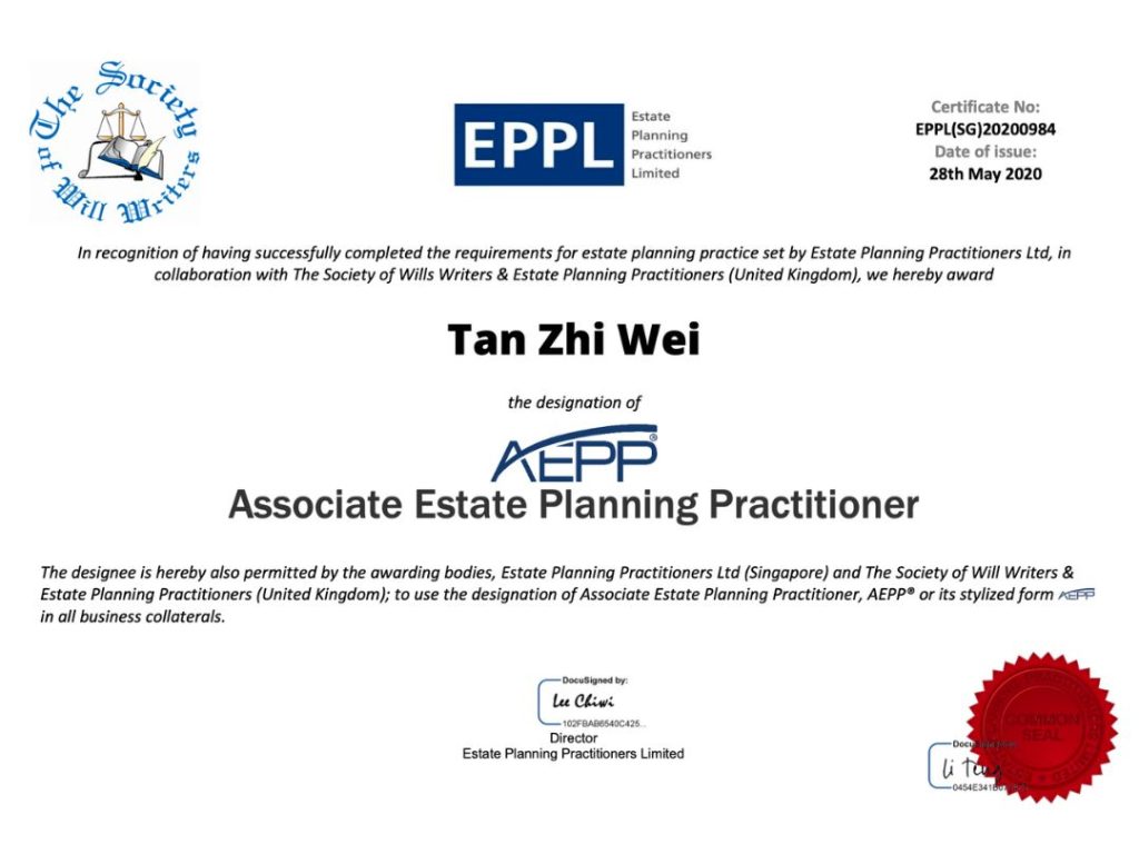 The Associate Estate Planning Practitioner (AEPP®) designation is awarded by the Society of Will Writers (SWW) of the UK and the Estate Planning Practitioners Limited (EPPL).